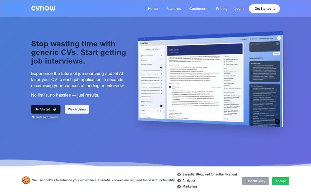 总之,CVnow 适合希望用更少时间提交更多高质量申请的求职者,通过 AI 自动化与专业模板的结合,帮助用户在竞争激烈的求职市场中提高命中率。