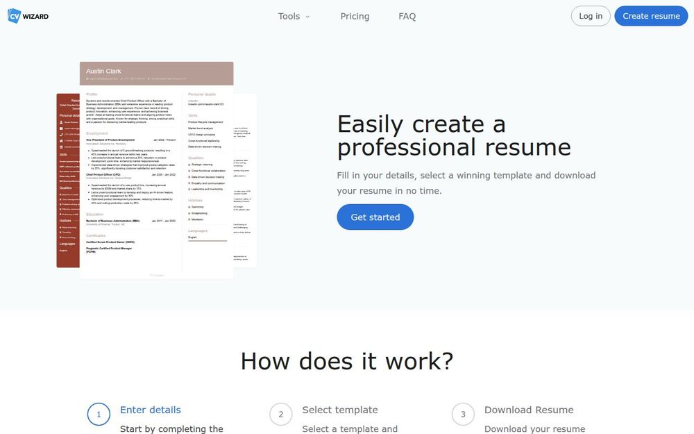 CVwizard 是一款面向求职者的在线简历与求职素材生成工具,旨在帮助用户快速创建专业、易读且符合 HR 要求的简历。用户通过填写个人信息、选择合适的模板并下载即可完成简历制作,全流程侧重于简单操作与模板质量,同时提供求职信、职位推送与申请管理等配套功能。