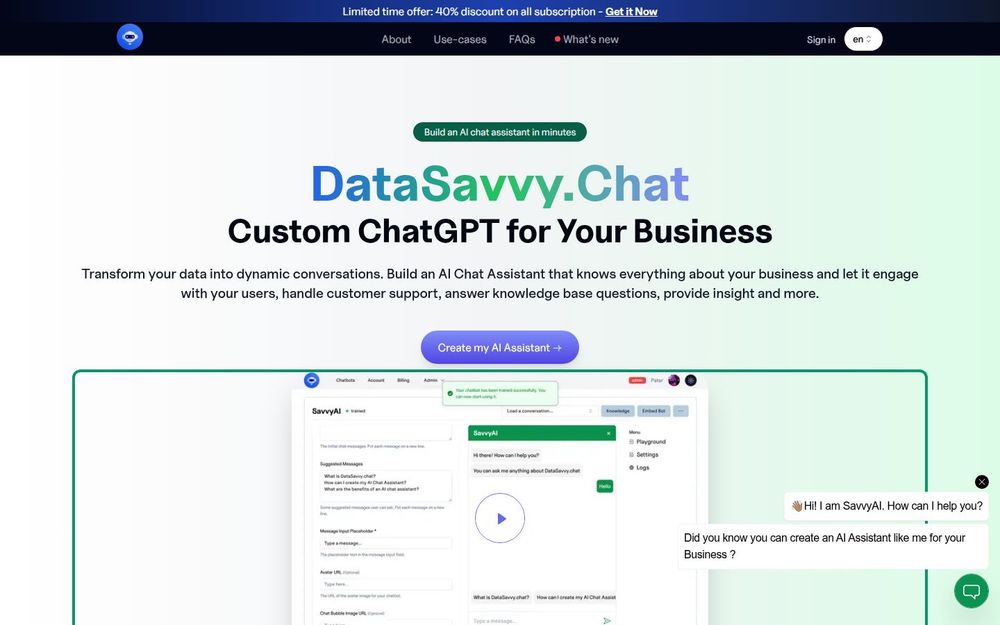 综上,DataSavvy.chat 适合希望以低成本快速试水 AI 聊天助手并逐步扩展到企业级定制的团队,兼顾易用性与可扩展性,是构建知识型、客服型与销售型智能助手的实用选择。