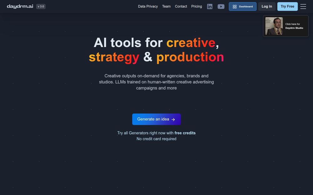 Daydrm 适用于广告公司、品牌团队、创意工作室以及独立创意人,尤其在需要快速产生多个概念、进行头脑风暴启动或将想法迅速转化为可执行提案时最具价值。界面设计以简洁易用为目标,并提供免费试用额度(无需信用卡),降低上手门槛。