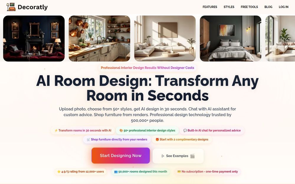 Decoratly 是一款面向家庭用户与设计专业人士的 AI 室内设计平台,核心目标是在数十秒内将任意房间照片转换为高质量、可实施的室内设计效果图。用户只需上传照片、选择风格,即可在 30 秒内获得逼真的渲染结果;内置的 AI 聊天助手 可基于实际房间提供定制化建议,并支持从渲染图中直接查找并购买相似家具。