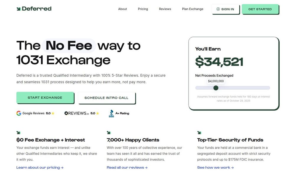 Deferred 是一家以“无费用(No Fee)1031 交换”为核心主张的合格中介,致力于通过技术和透明化流程重塑传统 1031 交换体验。它面向希望递延资本利得税的房地产投资者,提供线上发起、实时支持和专业顾问服务。Deferred 强调资金安全与客户收益:资金存放于商业银行的隔离账户,并提供高额 FDIC 保险、忠诚保证金和差错保险,同时将利息收益与客户共享。