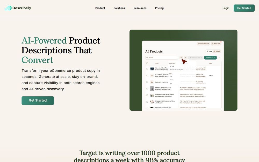Describely 的价值在于将速度、规模化与品牌一致性结合起来。Target 的客户案例显示首轮生成可达到 98% 的准确率,说明平台在可配置规则与数据充实方面表现优异。它既适合需要高吞吐量的企业级目录管理,也对注重 SEO 与搜索/AI 推荐曝光的商家有显著帮助。对希望减少内容生产成本、提升上架效率并保持品牌统一性的团队来说,Describely 是一个值得尝试的解决方案。