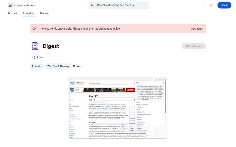 Digest 是一款基于用户自有 OpenAI/ChatGPT 账号的 Chrome 扩展,旨在为网页内容提供快速摘要与结构化大纲,加速阅读与导航长篇文章、文档与在线书籍。插件以简洁的界面和浏览器按钮为入口,用户可以一键显示或隐藏本页的摘要与大纲,从而节省阅读时间并快速把握要点。