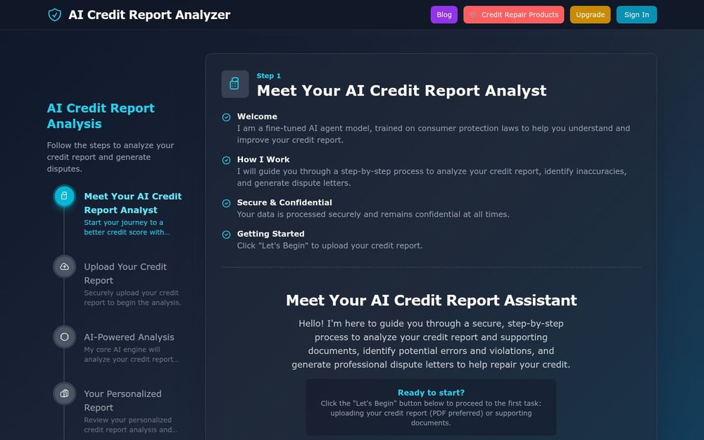 - 点击“Let’s Begin”并上传信用报告或相关证明材料(建议 PDF)。