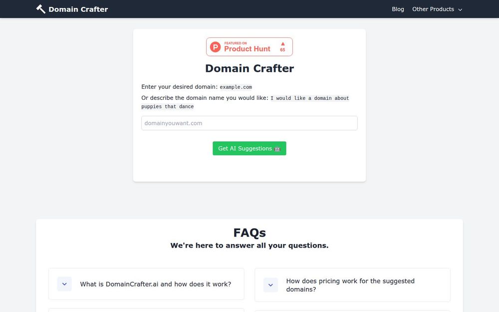 Domain Crafter 是一款面向创业者、品牌运营者和网站建设者的AI 驱动域名生成工具。用户可以直接输入想要查询的域名或用自然语言描述想要的主题(例如“关于跳舞小狗的域名”),系统会基于输入生成大量创意域名建议并同时检查其在多个后缀(如 .com、.net 等)上的可用性。该工具免费使用,通过与 Namecheap 的实时对接来验证可注册性,并提供直接跳转购买的链接以便用户迅速完成注册流程。