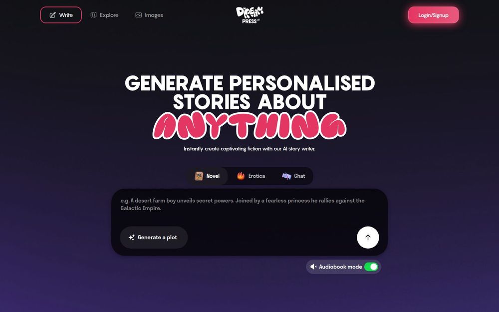 DreamPress 是一款面向写作者与创作者的 AI 故事生成器平台,旨在将用户的想法在短时间内转化为吸引人的故事内容。网站提供多种故事类型与模板,支持个性化设置、情节生成以及有声书输出,用户既可以快速生成完整小说,也可以与 AI 角色进行互动式写作或聊天式创作。