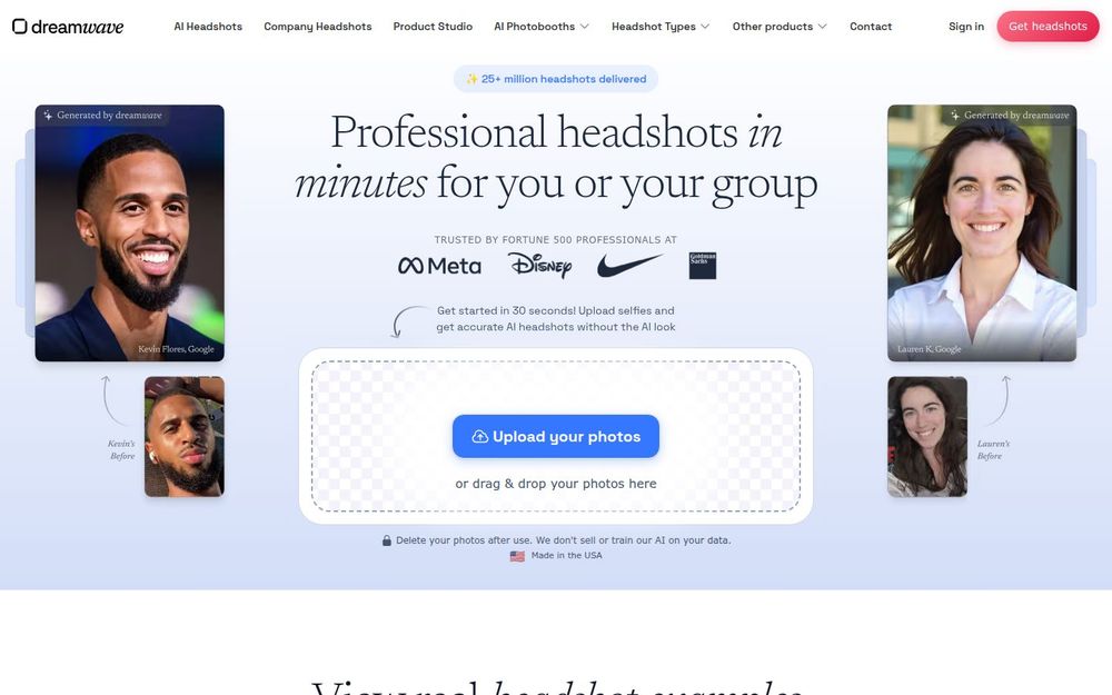 用户体验侧重简洁:在 30 秒内开始、上传或拖拽自拍、选择样式与人物示例,然后等待 AI 生成多套可选结果。平台页面展示大量真实客户的前后对比与用户评价,强调“无 AI 感、像真实摄影”的输出效果。对于企业客户,Dreamwave 提供统一风格与自动应用背景的批量工具,便于人事或品牌团队一键部署。