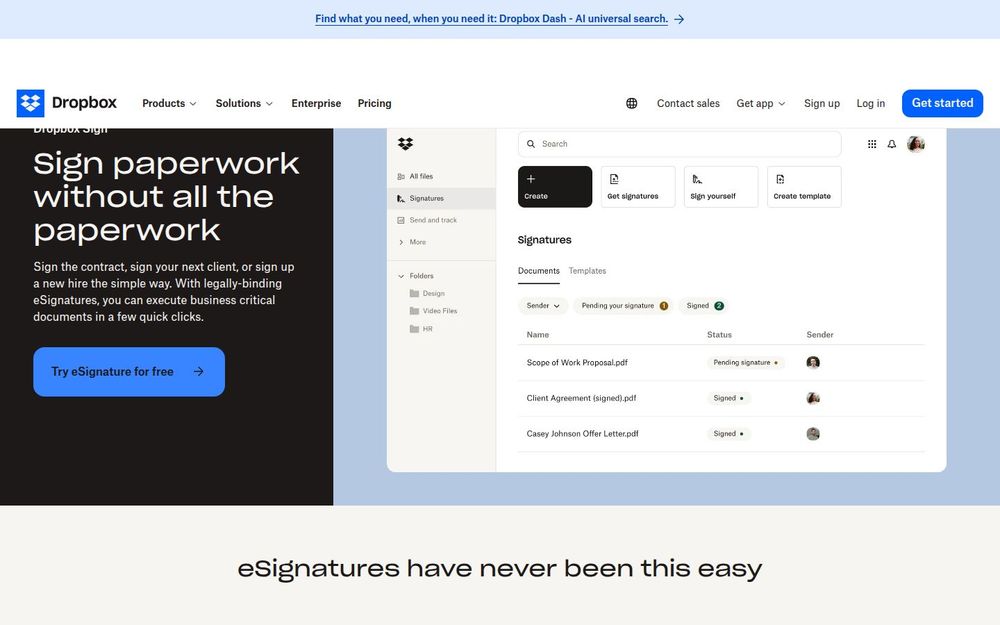 Dropbox Sign(原 HelloSign)是 Dropbox 提供的电子签名服务,专注于将传统的纸质签署流程数字化、自动化和安全化。该产品主打快速签署、模板复用与移动端支持,面向企业的合同管理、入职材料、财务文档和房地产等多种使用场景,旨在减少手动操作时间并提供具法律效力的电子签署记录。
