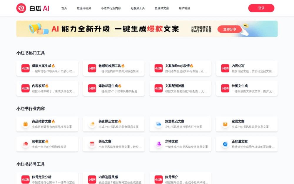 白瓜AI 是一款专注于“小红书+自媒体”内容创作的免费 AI 工具平台,旨在通过多样化的创作模块和行业模板,帮助创作者快速产出符合平台调性、具备传播力的图文与短视频脚本内容。平台界面直观,提供从选题到排版、从文案润色到配图匹配的完整流程支持,并强调对敏感词与版权风险的检测与规避。