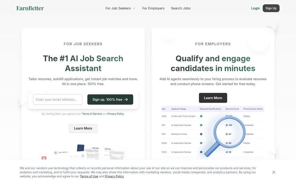 EarnBetter 是一款面向求职者与雇主的 AI 招聘平台,主打通过人工智能简化求职与招聘流程。对求职者而言,平台提供简历量身定制、自动填写申请、实时职位匹配等功能;对企业则提供 AI 面试官、简历评估与候选人资格筛选工具。该服务面向个人用户免费开放,并强调通过技术提高匹配效率与招聘质量。