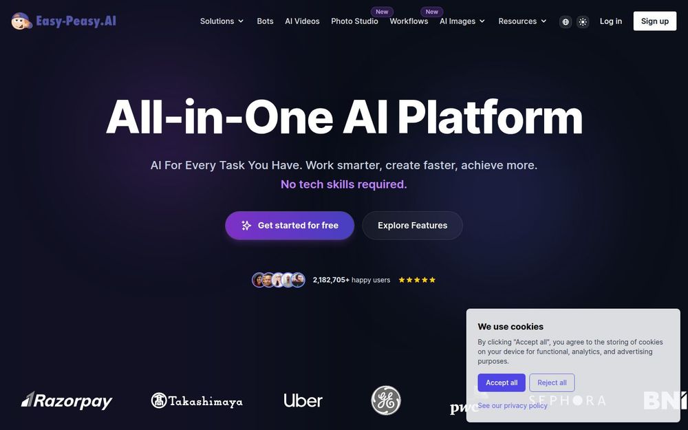 Easy-Peasy 是一款“All-in-One”一体化 AI 平台,旨在让各类用户无需技术背景也能快速创建高质量内容。平台汇聚多种顶级大模型,提供可视化的 AI Workflows(工作流),并通过模板、生成器和预设加速创作过程。无论是文案、图像、视频、语音还是客服代理,用户都能在同一平台内完成从创意到交付的全流程操作。