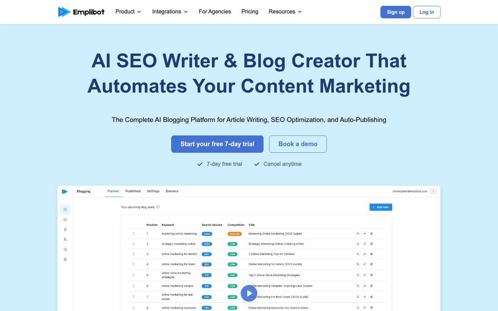 对于需要规模化产出博客内容并追求 SEO 成效的企业,Emplibot 能实现从选题、关键词到写作与发布的闭环自动化,显著节省人力与时间成本。