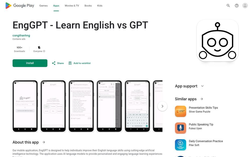 EngGPT 是一款将对话式人工智能引入英语学习的移动应用,目标是为学习者提供一个轻量、即时且私密的练习环境。应用采用类似 ChatGPT 的聊天模式,用户可以通过自然对话练习写作与口语表达,也能获得基于 AI 的即时纠错与建议。应用设计注重简洁的界面与流畅的交互体验,且标榜无需注册、部分功能可本地运行,降低学习门槛并提升隐私保护。