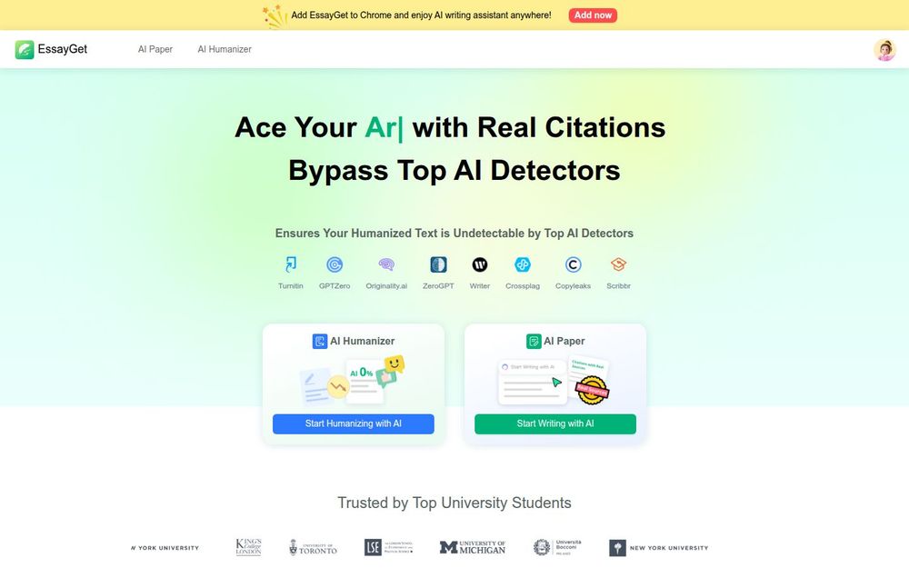 EssayGet 是一款结合写作生成与人性化处理的在线学术写作平台,目标用户为大学生和需要完成学术论文、报告的写作者。平台通过两个核心产品——AI Paper 与 AI Humanizer,提供从大纲生成、正文写作到引用格式化与反检测处理的一站式服务,号称能生成带有真实来源引用的论文并使文本难以被主流 AI 检测器识别。