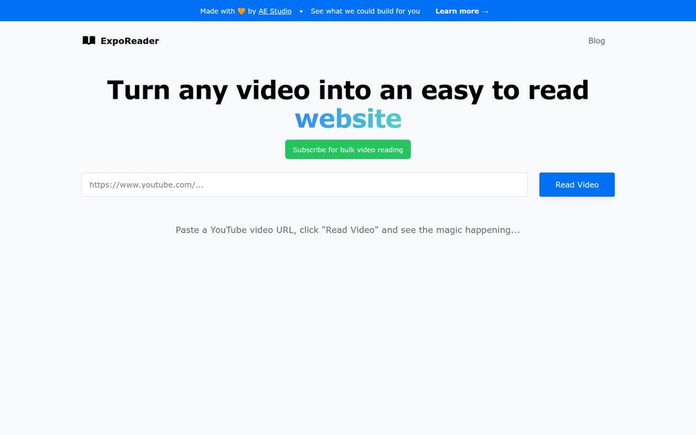 ExpoReader 是一款致力于将任意在线视频瞬间转化为易读网页的工具。用户只需将 YouTube 视频链接粘贴到页面,点击 “Read Video”,系统便会自动进行转写、摘要和页面生成。该产品面向希望将视频内容文字化、便于阅读、便于传播和 SEO 优化的个人和团队。