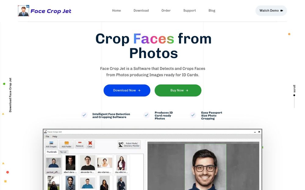 Face Crop Jet 是一款专注于从照片中自动检测并裁剪人脸以生成证件照或头像的桌面软件。它结合了 AI 人脸检测算法 与可配置的裁剪策略,旨在为学校、企业和各种需要批量生成证件照的组织提供高效的自动化解决方案。软件提供 Windows、macOS 客户端以及适用于 Windows Server 的服务版,可在本地完成所有处理,确保用户隐私。