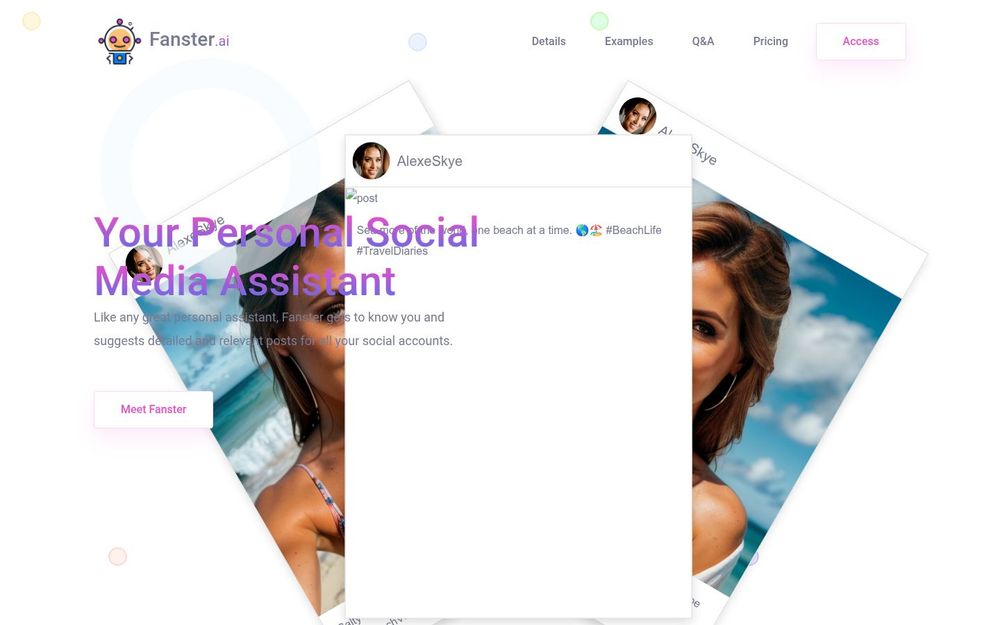 Fanster 是一款面向个人社交媒体管理的智能个人助理,通过分析用户提供的照片和偏好,为多平台社交账户自动生成高质量的帖子点子、文案、标签与可选图像。它结合视觉输入与个人兴趣,创建一种私密的数字模型,以提供定制化且风格一致的内容建议,旨在节省内容创作时间并提升社交影响力。