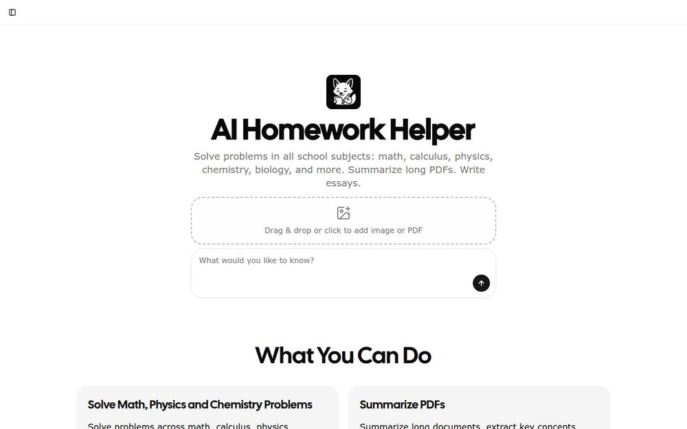 Feen AI 是一款面向中学、大学及研究人员的在线学习助手,核心定位为“AI Homework Helper”。它结合了图像识别、自然语言处理与数学求解能力,旨在帮助用户快速理解题目、生成逐步解答、整理文档要点并提升写作与研究效率。界面支持在网页端使用,并允许通过拍照、拖拽或上传 PDF 等方式提交问题与资料。