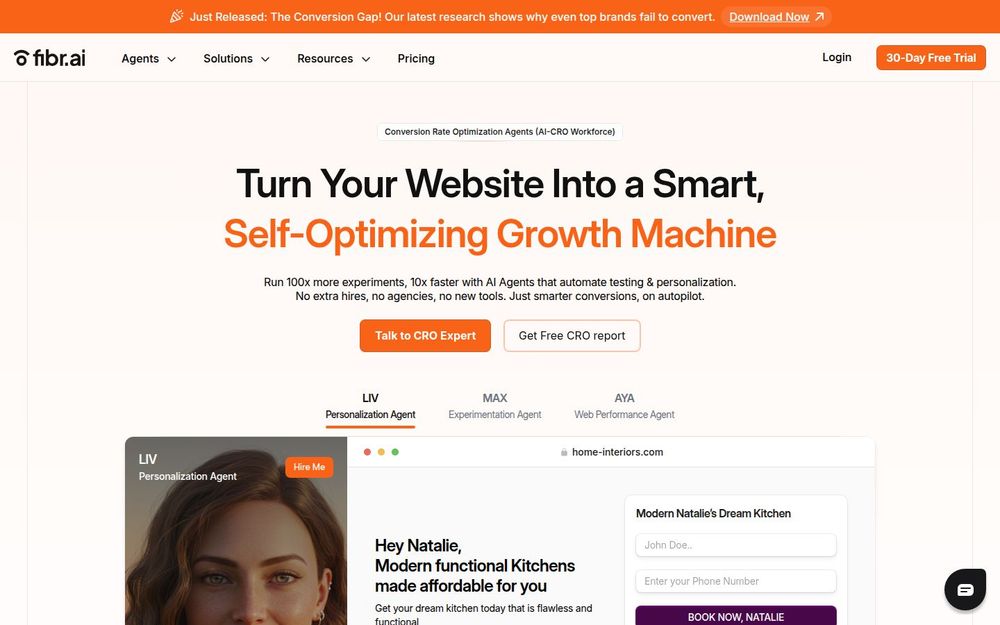 Fibr AI 是一款面向营销团队与增长團隊的 AI-CRO 平台,旨在把网站变成“会学习、会优化”的增长机器。通过部署多种专用 AI Agent(例如 LIV 用于个性化、MAX 用于持续实验、AYA 用于网站性能监控),Fibr 能持续生成假设、自动运行实验并根据真实数据迭代落地,显著提升转化率并降低获客成本。平台突出“无需额外招聘、无需代理、无需新增工具”的价值主张,强调易集成、可扩展与企业级安全合规。