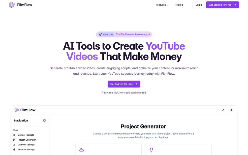 FilmFlow 适合想快速启动或扩展 YouTube 频道的个人创作者、中小团队以及代理和多频道业务。推荐理由包括:用 AI 流程化降低创作门槛、通过 SEO 与变现导向 的选题提升商业回报、以及 动态 CTA 帮助一键管理变现链接与推广活动,使创作更具规模化与持续盈利能力。