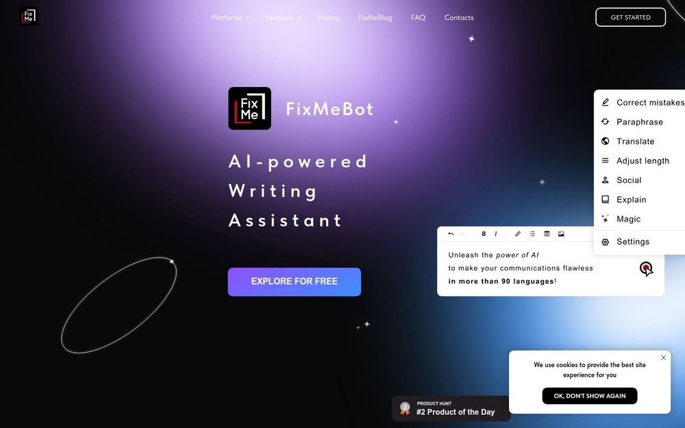 整体而言,FixMeBot 是一款定位清晰、功能全面的 AI 写作助手,适合希望在日常沟通、内容创作与跨语言交流中提高效率和质量的个人与团队。其多样的工具集与便捷的接入方式,使其在实际应用场景中具有较高的可用性与成长潜力。