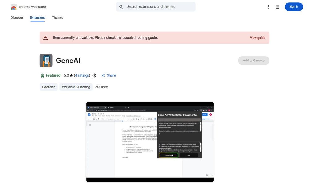 GeneAI 作为 Chrome 扩展发布,适用于 Chrome 浏览器环境。页面显示“Item currently unavailable”,表明当前可能无法直接安装或访问,建议查看页面提示的故障排查指南或稍后重试。页面还列出了目标语言为英文,但扩展的功能面向任何需写作辅助的用户。