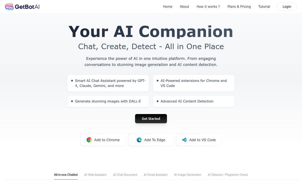 GetBot 是一款定位为“你的 AI 伙伴”的一体化平台,旨在将对话式 AI、内容创作与检测、图像生成与团队协作能力整合到同一个产品中。平台支持包括 GPT-4o、Claude-4.5、Gemini-1.5 等多款先进大模型,并提供浏览器扩展和 VS Code 插件,便于用户在日常工作流中直接调用 AI 能力。目标用户涵盖个人创作者、产品与工程团队以及需要快速生成内容与进行合规检测的企业。