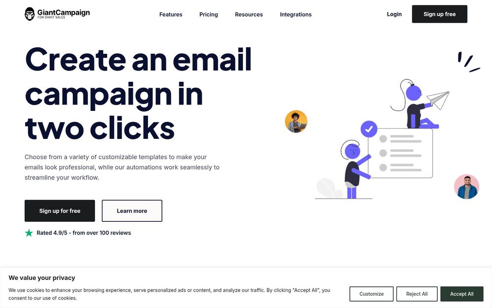 GiantCampaign 是一款综合性的电子邮件营销平台,旨在帮助企业快速创建高质量邮件、自动化客户旅程并通过数据洞察提升营销效果。网站主打“Create an email campaign in two clicks”,强调通过可定制模板与自动化工具降低操作复杂度,同时兼顾站内互动和多渠道整合,支持实时分析与丰富的第三方集成。