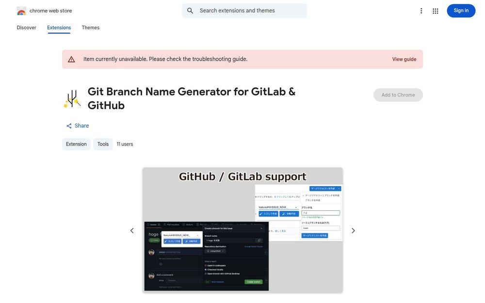 Git 分支名生成器是一款为 GitLab 与 GitHub 设计的 Chrome 浏览器扩展,旨在通过 AI 自动从 Issue 或问题标题生成规范化的分支名称。该扩展由开发者 Yohei 发布,版本信息为 2025.8.100,安装包体积约 532KiB,支持 English / 日本語 两种语言。注意:扩展需要用户提供 OpenAI API Key 才能工作,且 Chrome 商店页面可能显示 "Item currently unavailable" 或其它提示。
