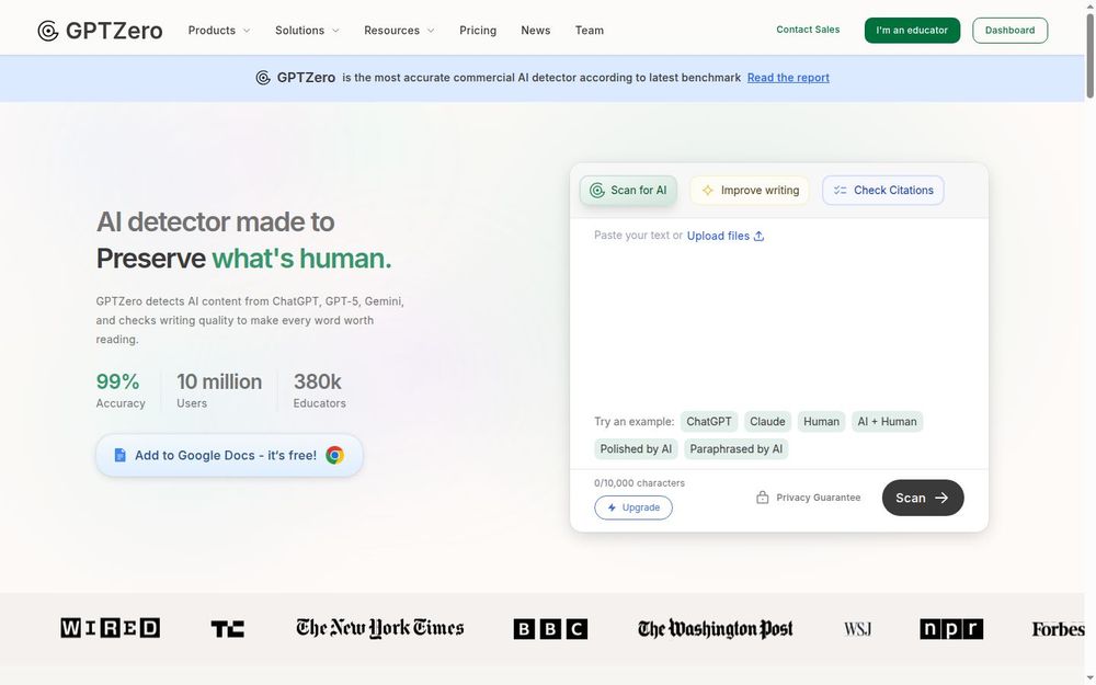 GPTZero是市场上最准确的AI检测工具,专为教育工作者和内容创作者设计。它能够识别由ChatGPT、GPT-5、Gemini等多个AI模型生成的文本,帮助用户确保内容的真实性和质量。