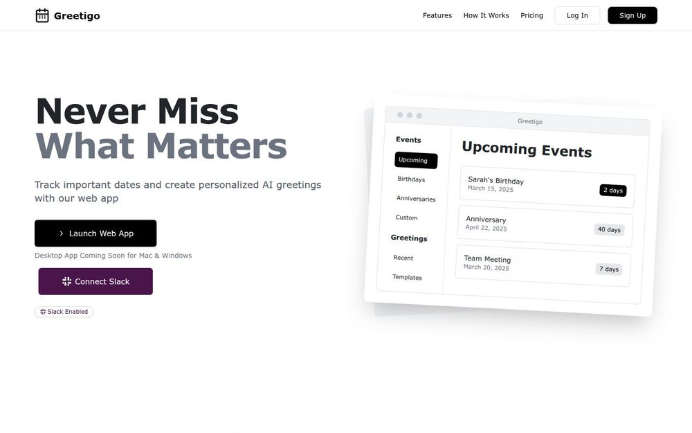 Greetigo 是一款面向个人与小型团队的桌面应用,旨在帮助用户“永远不错过重要日子”。它通过事件管理、智能提醒与 AI 驱动的问候生成,让用户能够轻松记录生日、纪念日、毕业典礼等关键日期,并自动在合适的时机发送或提醒。Greetigo 提供离线基础功能以保证隐私与可靠性,同时在联网时启用 AI 个性化问候与跨设备同步,用户界面简洁直观,支持 Slack 集成并计划发布 Mac 与 Windows 桌面客户端。