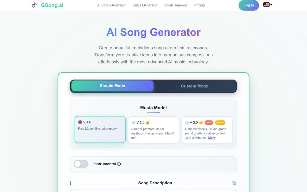 GSong 是一款面向创作者与内容制作者的在线 AI 音乐生成平台,用户无需下载软件即可在浏览器中完成从灵感输入到成品导出的整个流程。平台结合多代 AI 模型与可视化操作界面,支持从简洁提示快速生成完整歌曲,也可在自定义模式下对声线、乐器与编曲细节进行精细控制。GSong 同时提供免费试用额度与付费订阅选项,以满足不同用户的使用频率和商业需求。