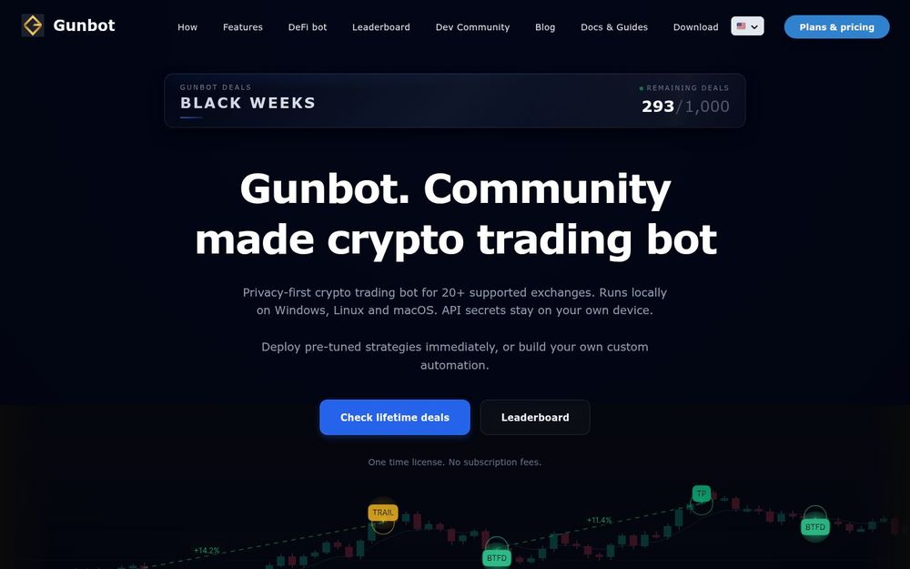 Gunbot 是一款面向加密货币交易者的本地自动化交易软件,专注于隐私保护与高度可定制的策略执行。它可以在 Windows、macOS 和 Linux 上运行,将 API 密钥与策略保存在用户设备上,避免云端持续保存敏感信息。Gunbot 提供终身许可并包含免费更新,支持现货与杠杆期货交易,覆盖中心化与去中心化交易所(如 Binance、Bybit、KuCoin、PancakeSwap 等)。
