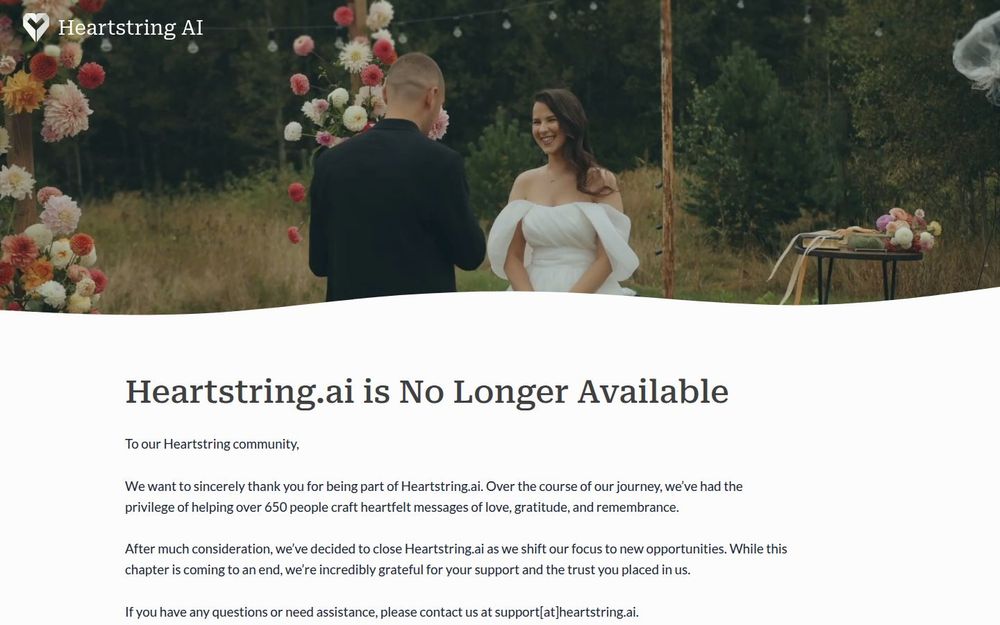 需要注意的是,网站页面明确发布公告表示 Heartstring.ai 已决定关闭服务,并对社区表示感谢。尽管如此,页面仍保留了注册通知、支持邮箱与联盟信息: