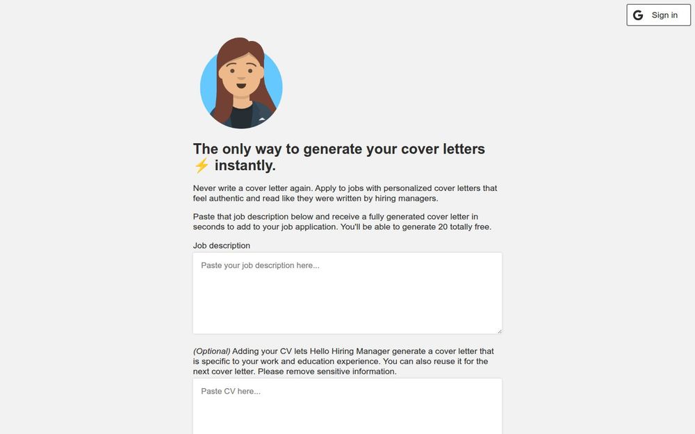 Hello Hiring Manager 是一款面向求职者的 AI 助手,旨在将繁琐的求职信写作过程自动化与个性化。用户只需粘贴职位描述,平台即可在数秒内生成一封可编辑的求职信;若用户上传个人简历,生成结果会更贴合个人经历与教育背景。该服务提供初始免费次数并通过账户系统管理使用配额,同时在网站提供博客、伦理守则、定价和隐私条款等说明内容,帮助用户了解服务边界与使用规则。