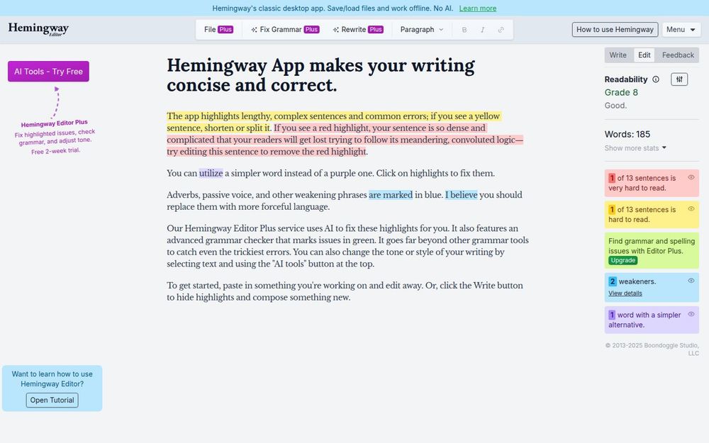 Hemingway 适合希望提高文字简洁度、面向大众读者写作的人群,例如博客作者、学生、内容编辑与产品文案。它通过直观可视化的反馈帮助你快速定位并改善冗长、晦涩或弱化表达的句子,从而在短时间内显著提升文本可读性。对于不希望依赖 AI 的用户,经典桌面版提供了安全且离线的写作环境;而希望节省时间或获得自动润色的用户,则可选择 Hemingway Editor Plus 获得更智能的修复与语气调整功能。