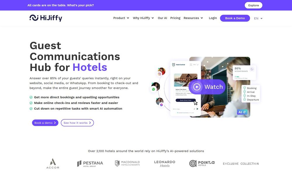 作为专注于酒店行业的会话式 AI 平台,HiJiffy 将客服自动化、预订引导、在住服务与营销活动整合在同一套系统中,既能提升客人体验,也能为酒店带来更高的直销收入与运营效率。