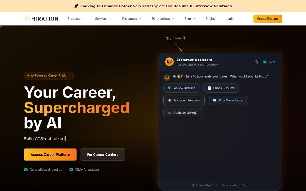 Hiration 适合希望借助 AI 快速提高求职效率的个人与高校/职业中心。它将多种职业工具集中于一处,既有便捷的一键生成与实时建议,也有面向招聘系统(ATS)优化的能力;同时,平台展示了大量使用与信任指标(如 2M+ 简历创建、10M+ AI 会话和企业客户),对希望提升通过率、减少手工打磨时间并获得结构化职业建议的用户具有明显吸引力。