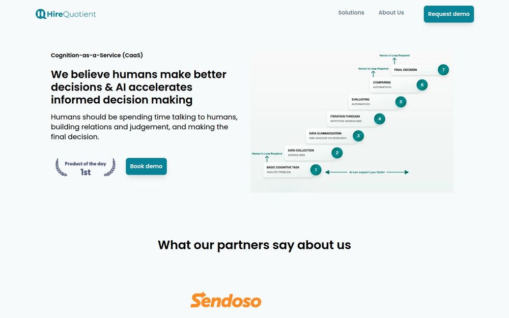 HireQuotient 以 Cognition-as-a-Service (CaaS) 为理念,提供面向企业的端到端招聘自动化解决方案,尤其针对非技术类岗位。平台的核心主张是把时间留给“人”去进行判断、建立关系和最终决策,而将信息收集、候选人发现与初步筛选交给 AI 与自动化流程来完成,从而提升招聘效率与命中率。