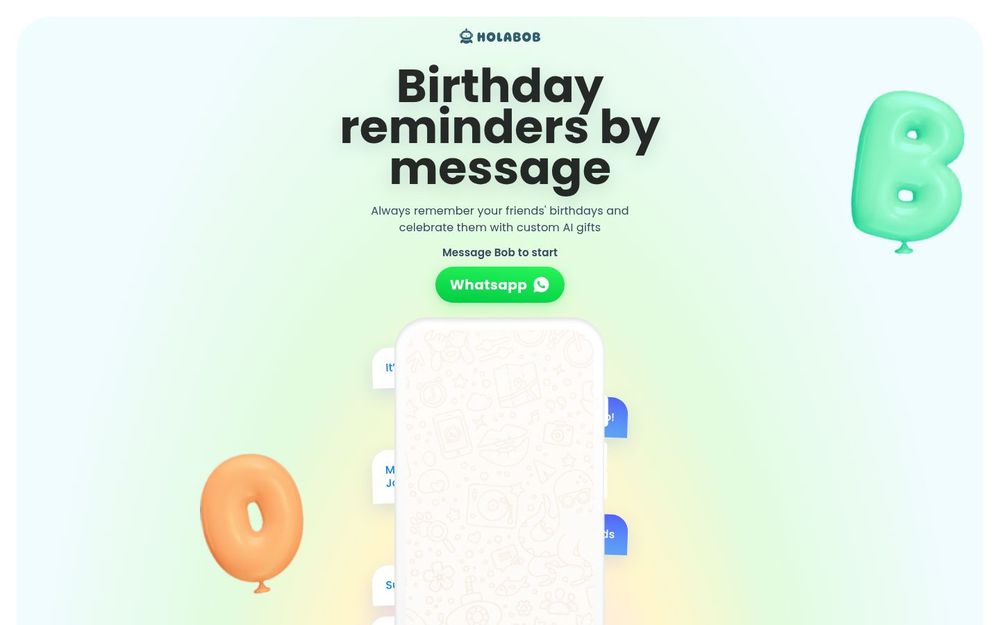 HolaBob 是一个以消息为入口的生日助理,主打通过 WhatsApp 与用户对话来管理生日提醒并生成定制化的 AI 礼物。用户只需向“Bob”发送消息即可开始,系统会记住朋友的生日、在合适的时间发出提醒,并能基于对话与少量输入,快速生成多种风格的电子礼物或祝福内容。界面轻便、上手快速,适合个人用户希望在忙碌生活中不再忘记重要日子并能用创意方式庆祝朋友和家人。
