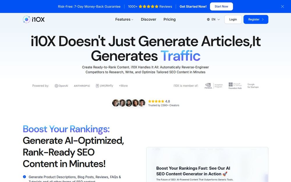 i10X 的核心价值在于把“研究—结构—写作—优化”这套繁琐流程自动化并可复制化,降低入门门槛同时提升产出效率。对于追求可衡量 SEO 成效(如提升自然流量、关键词排名、转化率)的用户,i10X 提供了从数据驱动的竞品洞察到成品交付的一站式流程,显著缩短上线周期并减少人工成本。其用户评价也展示了在实际项目中带来的排名与流量提升,适合作为构建长期内容矩阵的工具选择。