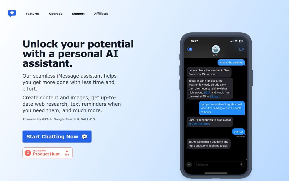 iChatWithGPT 是一款将强大 AI 能力直接嵌入 iMessage 的个人助理,目标是让用户在熟悉的消息环境中完成更多任务,节省时间并提升效率。它结合了 GPT-4 的自然语言理解、Google 搜索的实时信息 和 DALL·E 3 的图像生成,支持从内容创作、即时调研到提醒与语音控制的多种场景。产品强调无缝接入 Apple 生态(iPhone、Watch、Mac、CarPlay、Siri),并通过邀请制或升级方式提供付费扩展。