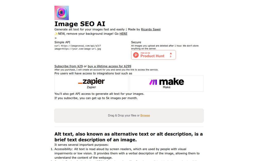 Image SEO AI 是一款专注于为图片快速生成高质量替代文字(alt text)的在线工具,适用于需要提升可访问性与搜索引擎优化的个人与团队。它提供简洁的 Web 界面与简单的 API 调用,支持拖拽上传并可批量处理图片,同时还新增了一键去背景功能。平台宣称对上传图片实行严格的隐私策略,图片会在服务器上于一小时后删除,并提供付费订阅和终身授权两种购买方式,专业用户可获得 Zapier、Make 等集成以及 API 访问权限,每月最高支持到 5000 张图片的生成量。整体定位实用、轻量,适合内容创作者、电商、网站运营者以及希望自动化图像描述流程的开发者使用。
