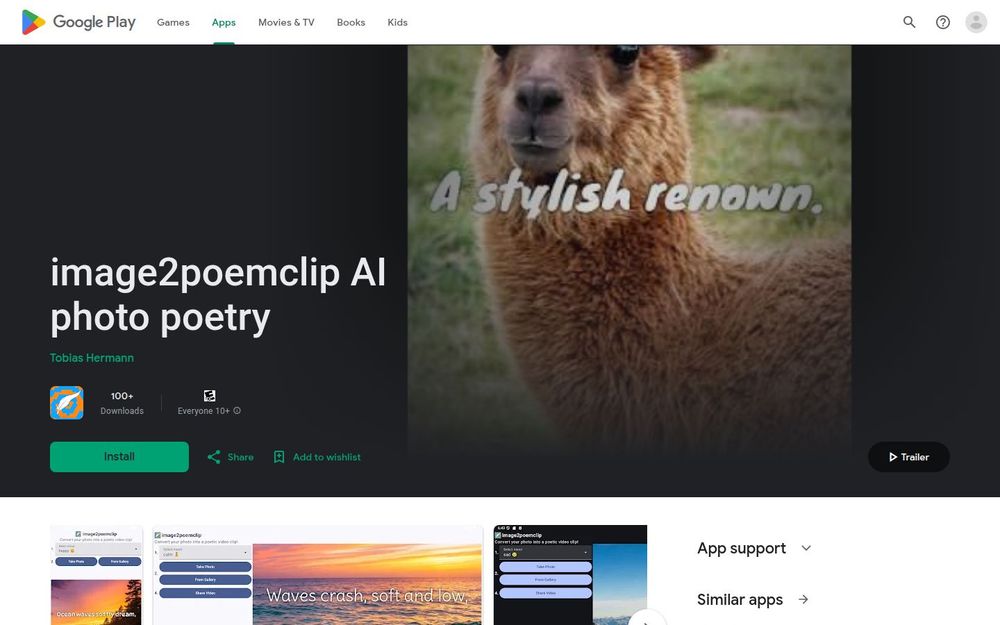 image2poemclip 是一款将静态照片瞬间转化为“诗意视频”的创意应用。它通过内置的人工智能模型分析图片内容并生成原创诗句,再将诗句与用户选择的照片和背景音乐合成为短视频,方便分享到社交平台、消息工具或作为个性化礼物使用。该应用由 Tobias Hermann 开发,分类于 Art & Design,强调简单易用与情感表达。