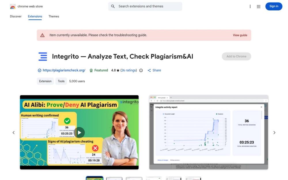 Integrito 是 PlagiarismCheck.org 推出的 Chrome 扩展,旨在为教学与写作流程提供可信赖的原创性与来源分析。该工具可以在浏览器中一键检测选中文本或页面内容的相似性与 AI 生成概率,同时生成可导出的详细报告(Activity report),帮助学生证明写作过程,也帮助教师识别抄袭或代写风险。