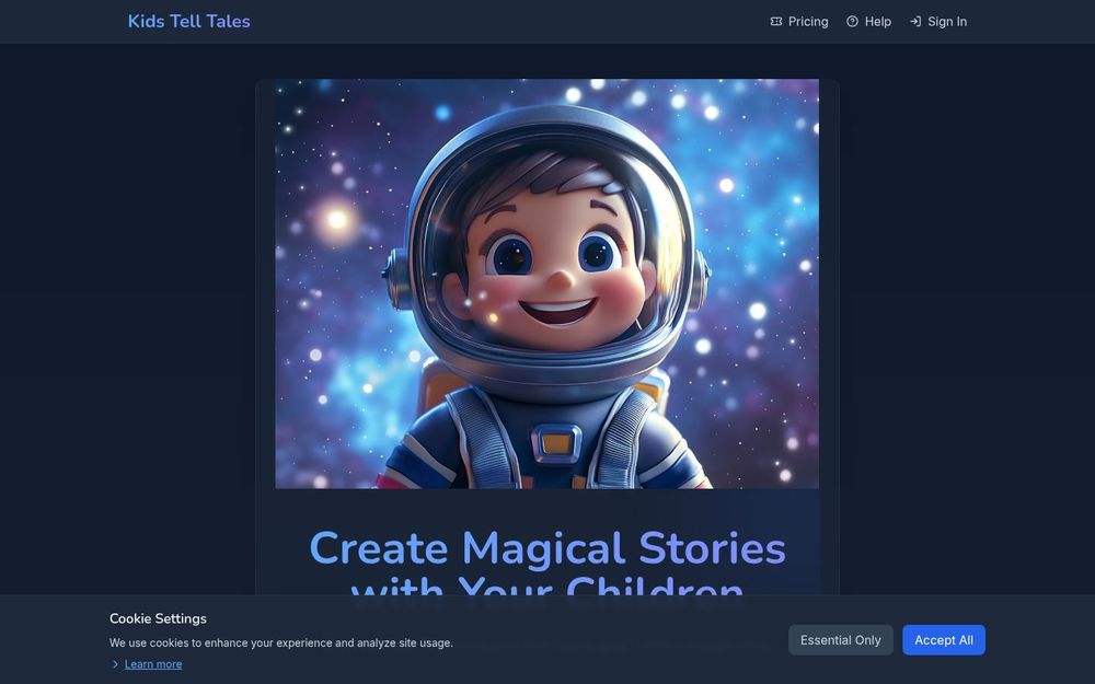 Kids Tell Tales 是一个为家庭和孩子设计的互动故事平台,利用人工智能生成个性化故事,让孩子在听故事的同时参与决策,体验沉浸式阅读与想象力训练。平台支持选择年龄段与故事长度,并在情节关键处提供多条分支选项,从而形成多结局的互动冒险。页面友好,且包含示例故事和家长评价,便于快速上手与试用。