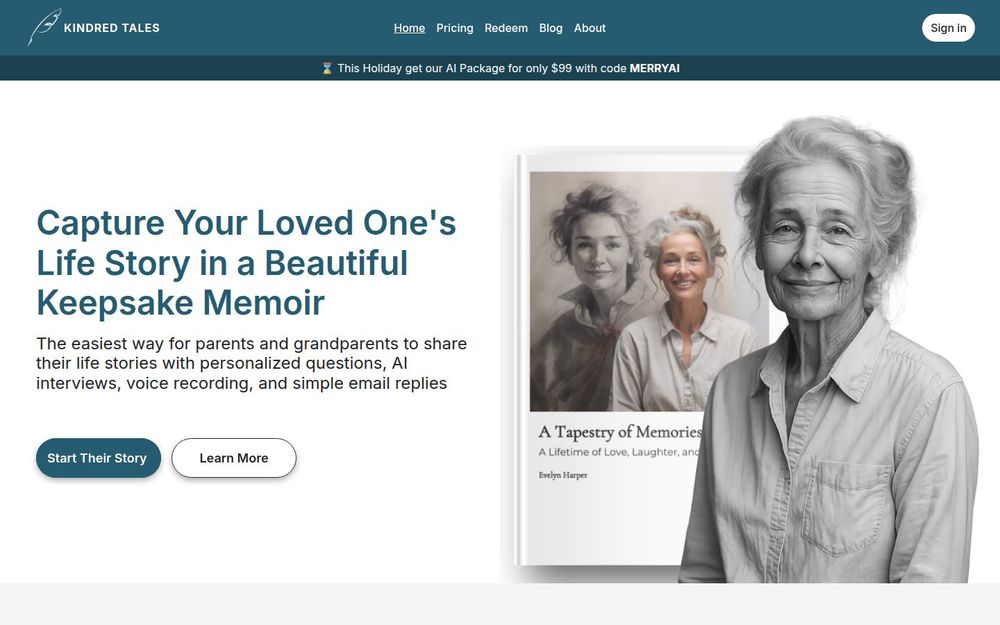 Kindred Tales 致力于将父母与祖父母的生命故事转化为可传世的精装纪念书。服务结合了人为引导与人工智能技术,从逐周写作提示到AI 访谈助手与语音转文字,支持多种上传与协作方式,最终输出高品质的硬壳影集,方便家庭保存与传承。
