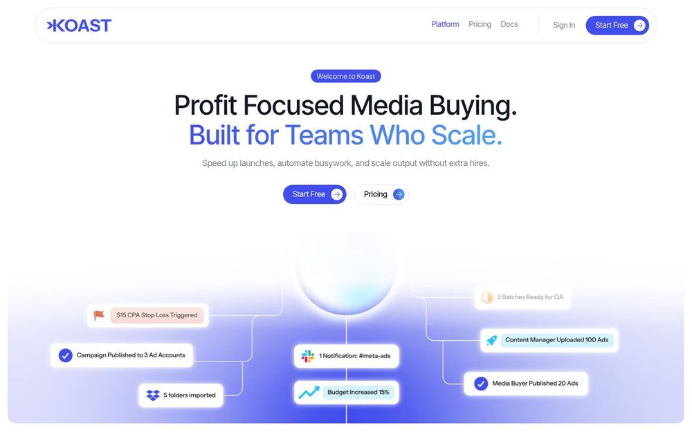 Koast 是为高频率广告发布与规模化媒体采购设计的集中化平台,旨在将繁琐的投放流程、素材管理与跨账号协作合并到一个利润驱动的工作区。平台强调速度、可控性与盈利保护,通过模板化设置与智能自动化减少人工操作时间,让广告团队把更多精力放在策略与创意上。