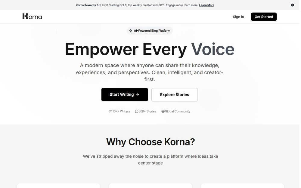 Korna 是一个现代化的博客平台,旨在为每个人提供一个分享知识、经验和观点的空间。我们相信每个人的声音都值得被听到,因此我们创建了一个干净、智能、以创作者为中心的环境,让你的故事能够被更多人看到。